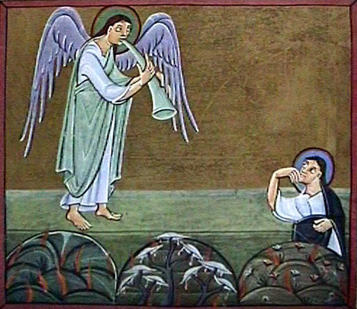 The illustration is the First Trumpet, using a low-resolution version available on the web. The originals in their digital version clearly reveal much more of the detail and the spectacular gilding.