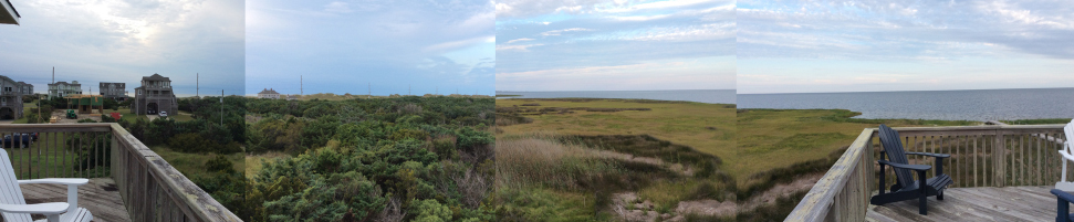 My wife and I just returned from a very relaxing vacation at our daughter’s rental house in Frisco, N.C. The house is called Sounds Frisky. rented through Surf or Sound Realty. It is the last house on the last street in Frisco before crossing the road along Sandy Bay on NC 12 headed toward Hatteras Village. Above are two views from the 3rd floor deck. The first view sweeps from the view south toward the Atlantic Ocean and runs 180 degrees toward the northward view across Pamlico Sound. Sandy Bay and Hatteras village are straight ahead from the right center. The second view is from the back deck (with a 90 degree turn, showing more of Pamlico Sound starting the with private beach (and private dock) behind the house toward Buxton (site of Hatteras Light) and Avon.