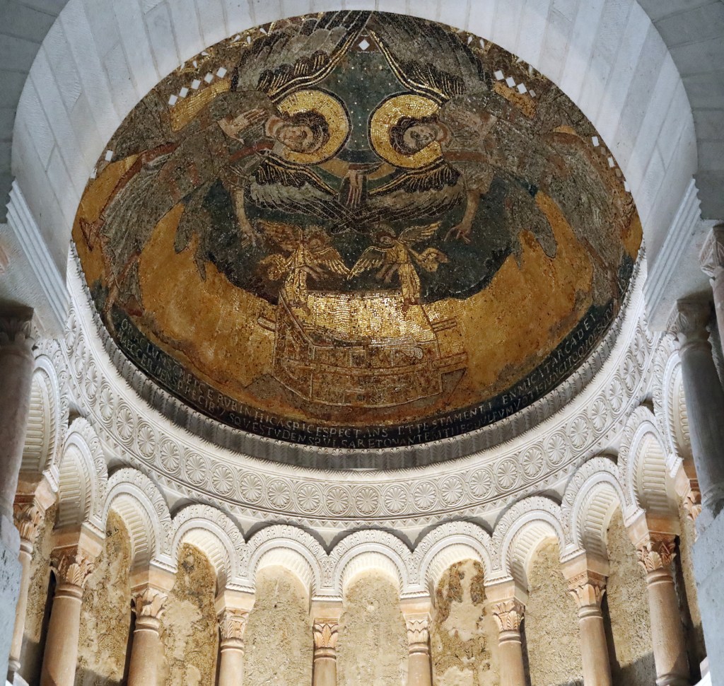 The Palace was designed by Odo of Metz, the same Armenian designer whose work in France was illustrated earlier in this series. The Palace was consecrated by Pope Leo III in 805 A.D. The mosaic is Illustration No. 36 in our publication, Angels: In Scripture, Art & Christian Tradition. The influence of Byzantine styles from the age of Constantine and Justinian is clear. Damage to the structure during bombing in World War II was repaired between 1986 and 2011. The building was used for coronations for several centuries after the death of Charlemagne.