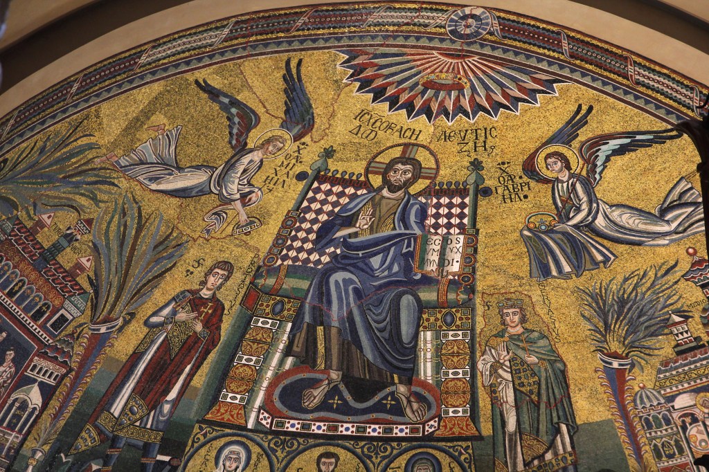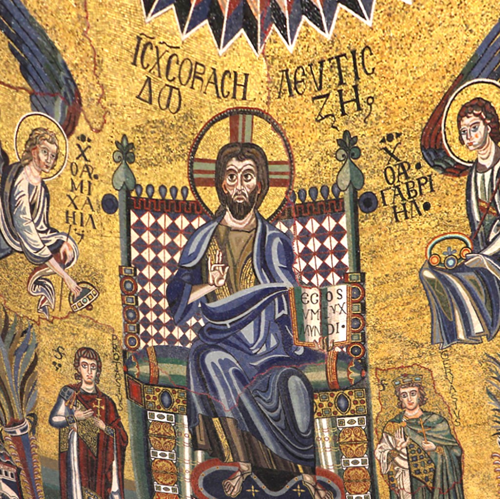 Jesus continued to befuddle His inquisitors with a second citation of Scripture regarding David. He quoted Psalm 110:1, the most-quoted verse in all the Psalms. As Matthew recorded in the closing verse, no one thereafter asked Him any more questions. In Christian art, the Gospel reading is generally depicted by a graphic displaying the words quoted by Jesus. For this blog post, I offer you a graphic which I adapted from a Christ Pantokrator mosaic (literally: Ruler of the Universe) from the Basilica of St. Ambrose, Milan, Italy. Because this Byzantine-style mosaic is very high above the floor level any photographs are distorted by sightlines diminishing toward top center. In the mosaic, Jesus is seated on a throne with the Archangels Michael (left) and Gabriel (right) and several saints. I used this image in the AIC Bookstore Publications, The Gospel of Mark: Annotated & Illustrated (Illus. # 66), Angels: In Scripture, Art & Christian Tradition (Illus. # 13) and Christmas: In Scripture, Art & Christian Tradition (Illus. No. 58). All books are available through my Amazon Author Central page. The image was also used in several AIC Video series, including The Great “O” Antiphons, Episode Two – O Adonai; The Twelve Days of Christmas, 2nd Day – Dec. 26th, 11th Day – Jan. 4th & 12th Day – Jan. 5th; In the Cross of Christ I Glory, 3rd Word, 6th Word, 7th Word; Eastertide, Episode 1; The War on Christianity, Episode 6; Trinitytide: the Teaching Season, Episode 7; and New Testament: Gospels, Episode 2.