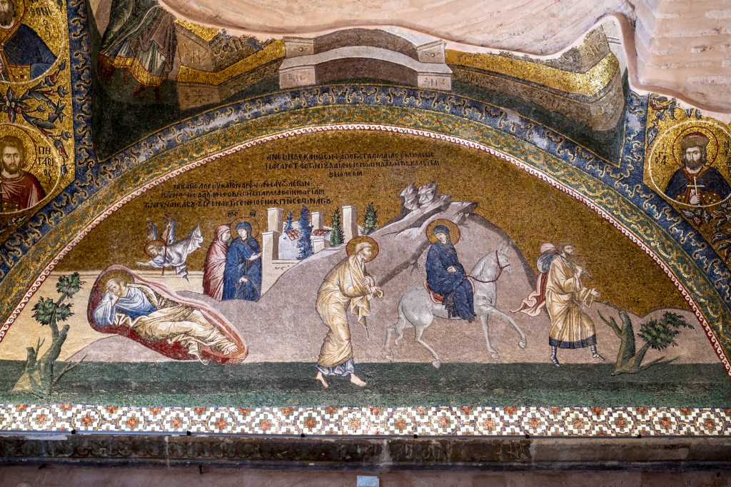 The actual visit of the Wise Men, or Magi, is depicted in another late-Byzantine mosaic, also in the Outer Narthex (or exonarthex), in this case at the rear of the Outer Narthex above the opening into the Church’s Parakklesion, effectively a funeral chapel. For more views of these and other Byzantine mosaics and frescoes illustrating hundreds of Scriptural scenes at Chora, visit the Chora Church web site. Another site with nearly a hundred images is available at https://thebyzantinelegacy.com. Yet another is https://www.360tr.com, which offers “virtual” tours you can manipulate. For the 3-D tour, it may take a little practice manipulating the view (forward, sideways, upward), but you will find the effort worthwhile as you move, in the virtual sense, through the Outer Narthex, the Inner Narthex (or Esonarthex), the Naos (the equivalent of the modern Nave and Altar) and the Parakklesion (with its spectacular representation of The Harrowing of Hades (or Anastasis). While at the site be sure to direct the pointer to look upward into the large Christ Pantokrator dome (#8) and the smaller Blessed Virgin dome (#9) in the Inner Narthex and the Church’s third dome in the righthand portion of the Outer Narthex.