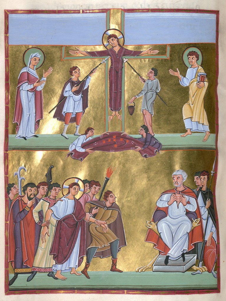 For Tuesday in Holy Week, the Gospel reading, Mark 15:1-39, is another long citation from the 1928 Book of Common Prayer (American edition, 1943 version) which begins with the trial of Jesus before Pilate and ends with His death upon the cross. The illustration for today is another outstanding example of Christian art that was produced at Reichenau Monastery, Reichenau, Germany. The source is the Pericope Book of Henry II. Henry II was the last of the Ottonian Holy Roman Emperors in Europe. The Christ before Pilate scene appears as Illustration No. 76 in our bookstore publication, The Gospel of Mark: Annotated & Illustrated. The volume is available exclusively through my Amazon Author Central page. Additional information about the book is found on the AIC Bookstore page. The Gospel of Mark volume was featured in my Blog post for February 5, A.D. 2026, which is linked from the Archives column at right.